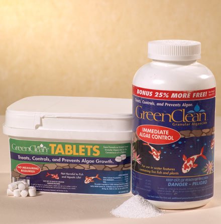 GreenClean Granular Algicide is an EPA-registered algicide that kills string algae on contact, showing instant results. This innovative algae destroying product is ideal for use in many situations, including fish ponds, water gardens, waterfalls and birdbaths. GreenClean is non-harmful to fish and is perfect for spring cleanouts and maintaining your water features all year long. Fast, reliable, algae control, GreenClean Granular Algicide. Click here for quick facts about GreenClean direct from the manufacturer.